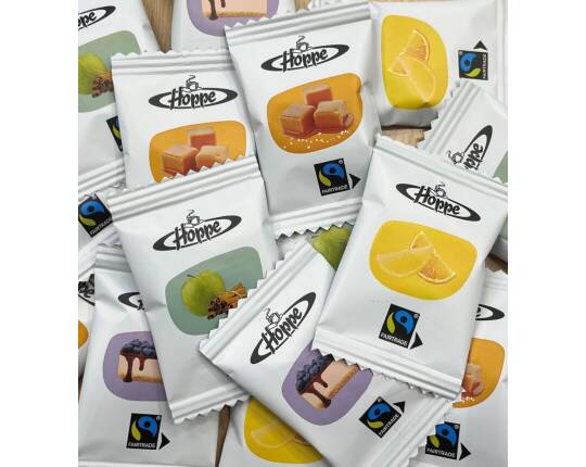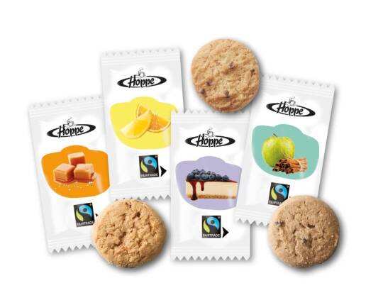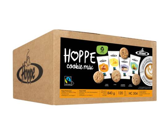 Your four favorite fairtrade Hoppe Cookies -known from the stylish, resealable and recyclable standup pouches- are now individually wrapped in recyclable foil. Deliciously crunchy and creamy, they come in contemporary flavors: citrus, blueberry cheese cake, salted caramel and apple cinnamon. A handy mixed box offers plenty of variety to truly surprise your guests.